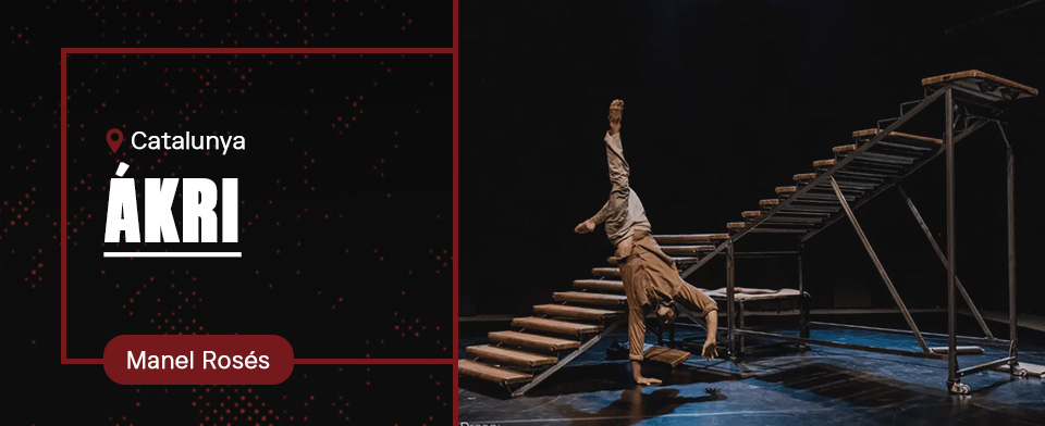 Ákri és un solo de circ d’un acròbata i una escala que explora el concepte de “llindar”. L’escala, que és aparell de circ i escenografia a la vegada, representa una zona de pas entre dos espais a l’hora que simbolitza un ofici i un mode de vida. Com vivim el temps que passa entre dos moments? Com habitem aquests no-llocs que, com una escala, no estan pensats per ser habitats?